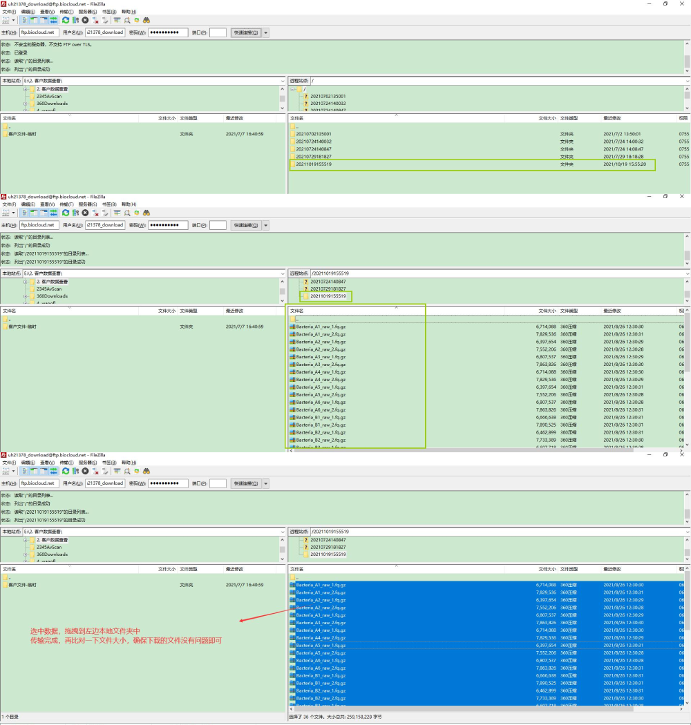 打開 FTP 客戶端:依次填寫好上述主機,用戶名,密碼,端口信息,打開之后選擇最新的文件夾,里面就是剛剛選中打包下載的數(shù)據(jù),然后直接選中數(shù)據(jù),拖拽到左邊目標文件夾中即可。