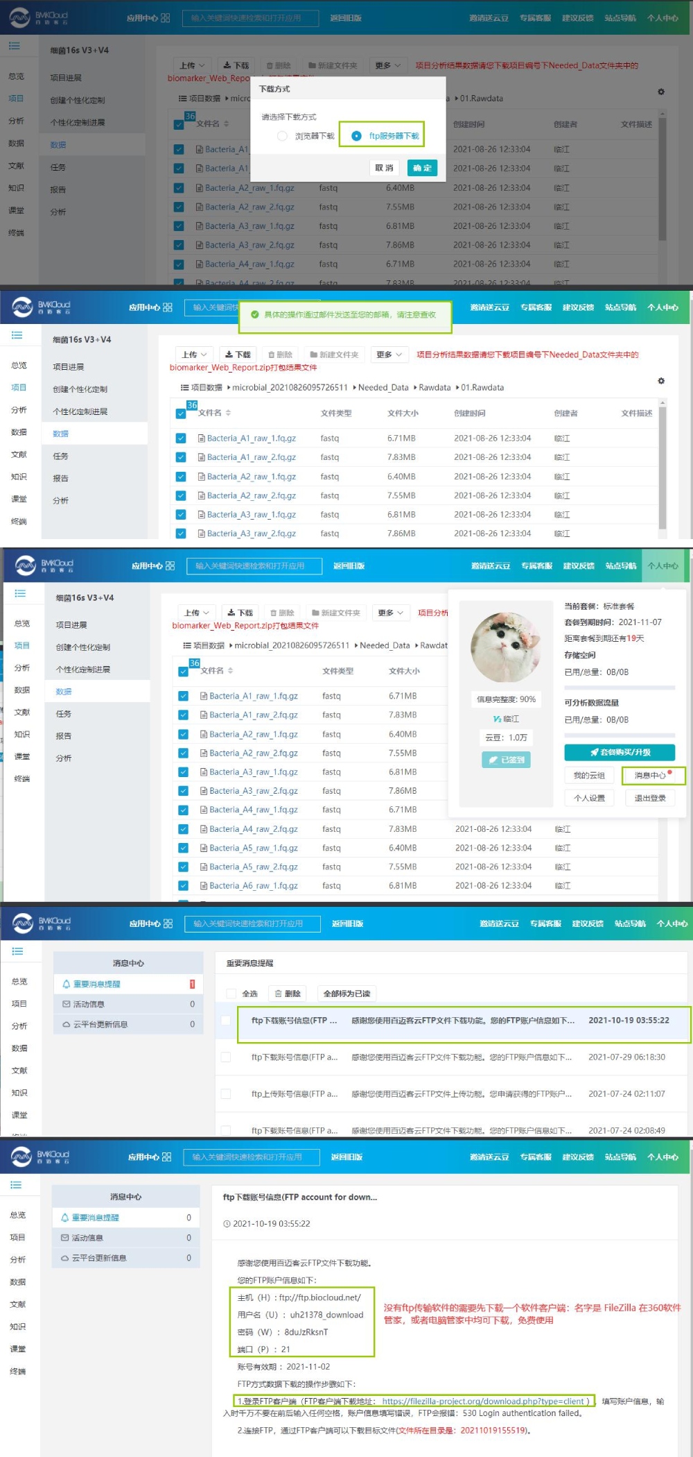 FTP 下載指導:下載方式選擇 FTP 下載,平臺會將具體的操作步驟發(fā)到注冊郵箱賬號中,也會發(fā)到個人中心信息中,如下: