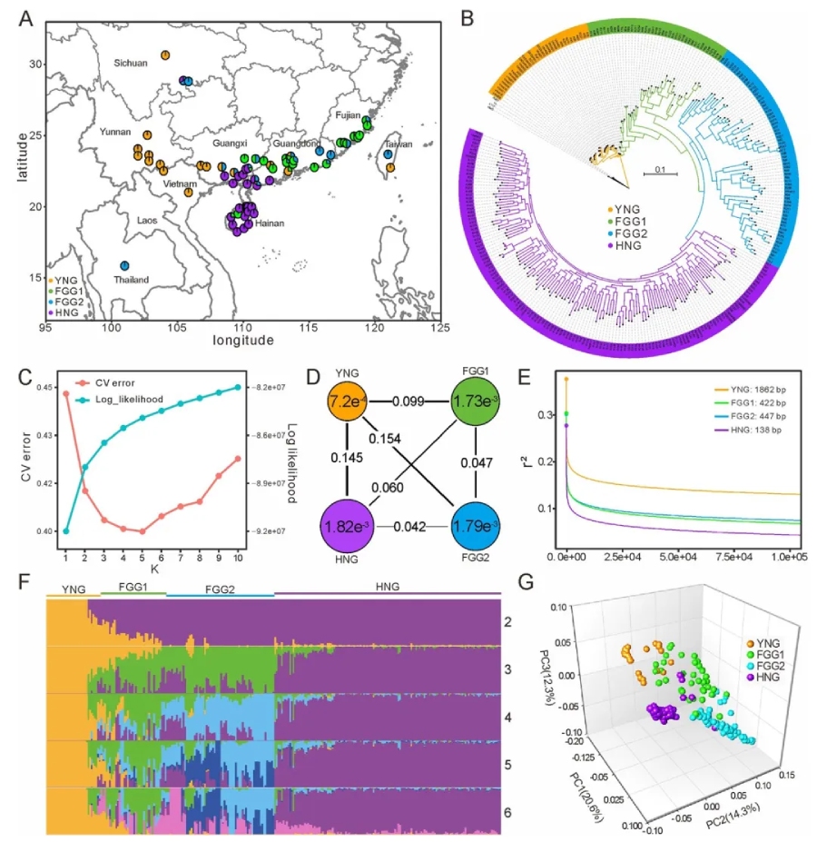 隨后,分析了群體結(jié)構(gòu),在基因組水平上揭示了群體之間的遺傳變異水平和親緣關(guān)系,分析表明該群體內(nèi)存在四個(gè)主要亞群:YNG(云南亞群,來(lái)自云南野生、廣西大興的種質(zhì))、HNG(海南亞群,來(lái)自海南和廣地博白的種質(zhì))、FGG1, 和FGG2亞群(包含來(lái)自福建和部分廣東、廣西的種質(zhì))。YNG的核苷酸多樣性低于HNG、FGG1和FGG2的,LD遺傳距離的大于其他三個(gè)亞群(圖1)。