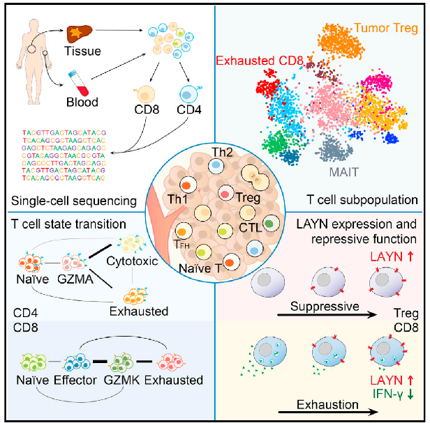 2017年,張澤民院士研究組,通過大規(guī)模單細(xì)胞測序技術(shù)對肝癌相關(guān)T淋巴細(xì)胞進行分析,首次在單細(xì)胞水平上描繪肝癌微環(huán)境中免疫細(xì)胞圖譜,發(fā)現(xiàn)了肝癌免疫療法的潛在靶點,也為我們從多角度系統(tǒng)性理解肝癌T淋巴細(xì)胞特征奠定了基礎(chǔ)。(2017,Cell,Landscape of Infiltrating T Cells in Liver Cancer Revealed by Single-Cell Sequencing)