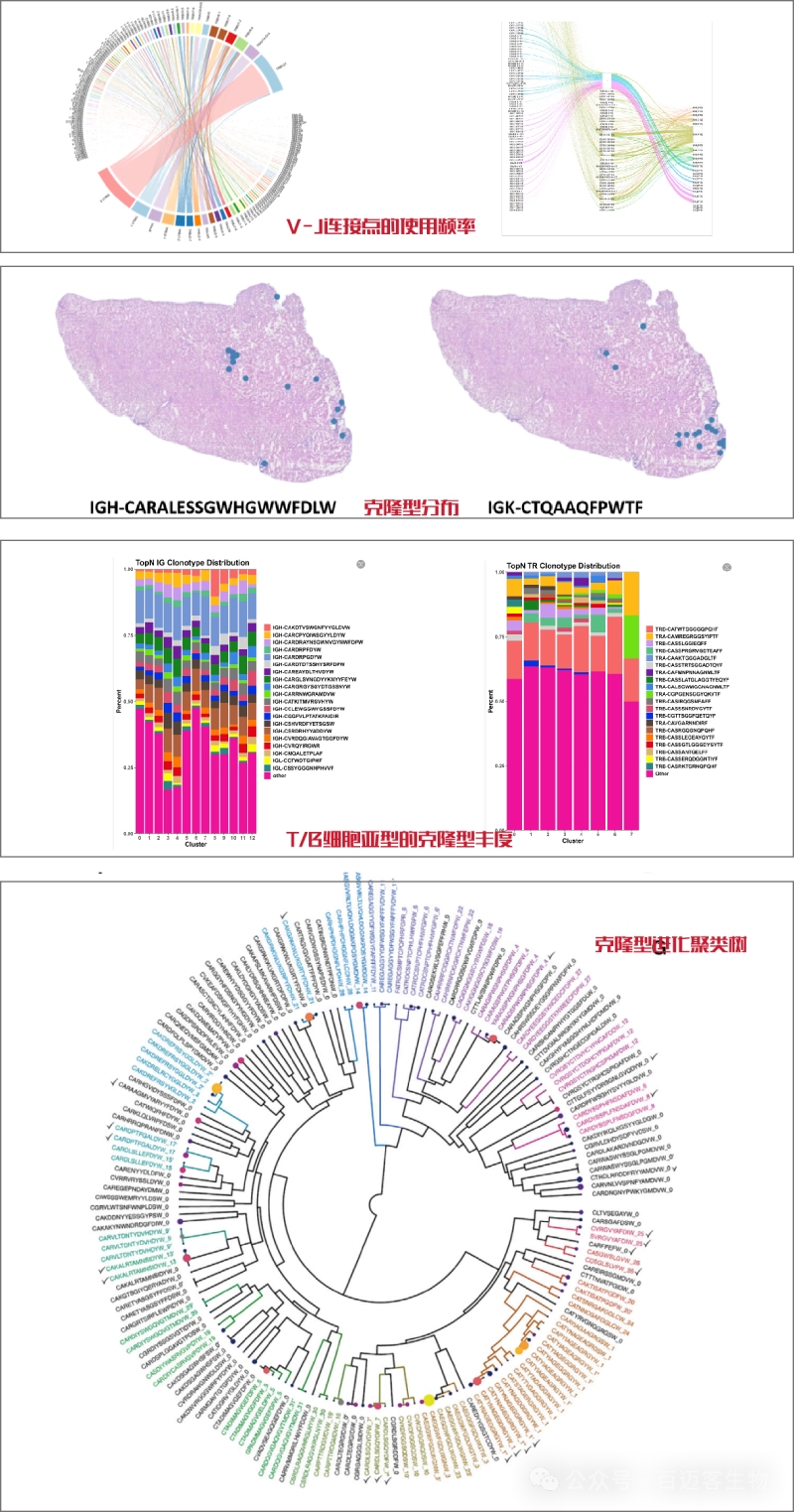 腫瘤樣本我們可以類比為一處具有復(fù)雜地貌的特殊地理環(huán)境,不同的環(huán)境造就了各種細(xì)胞的不同狀態(tài),而T/B細(xì)胞在不同的“選擇壓力”下邊進行了不同的“適應(yīng)性進化”。對不同生態(tài)位的T/B細(xì)胞尤其是TCR/BCR進行測定,有助于我們?nèi)ソ沂久庖呒?xì)胞的克隆起源和進化過程。例如,通過分析TCR的VDJ重排,可以追蹤T細(xì)胞克隆的起源和擴增過程。這種分析有助于理解免疫細(xì)胞在不同生理和病理狀態(tài)下的動態(tài)變化。