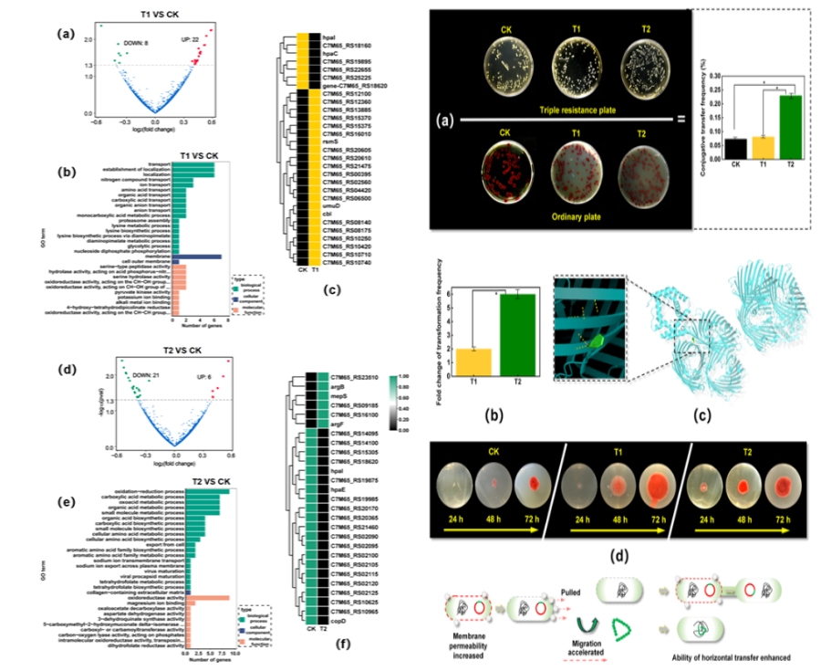 納米塑料暴露顯著提高粘質(zhì)沙雷氏菌的接合轉(zhuǎn)移頻率(T2 組 22.98%、T1 組 8.13%、CK 組 7.35%)和游離質(zhì)粒轉(zhuǎn)化能力(T2 組轉(zhuǎn)化頻率是 CK 組的 6 倍,T1 組是 CK 組的 2 倍),且轉(zhuǎn)移的質(zhì)粒攜帶多種抗性基因和外排泵基因。