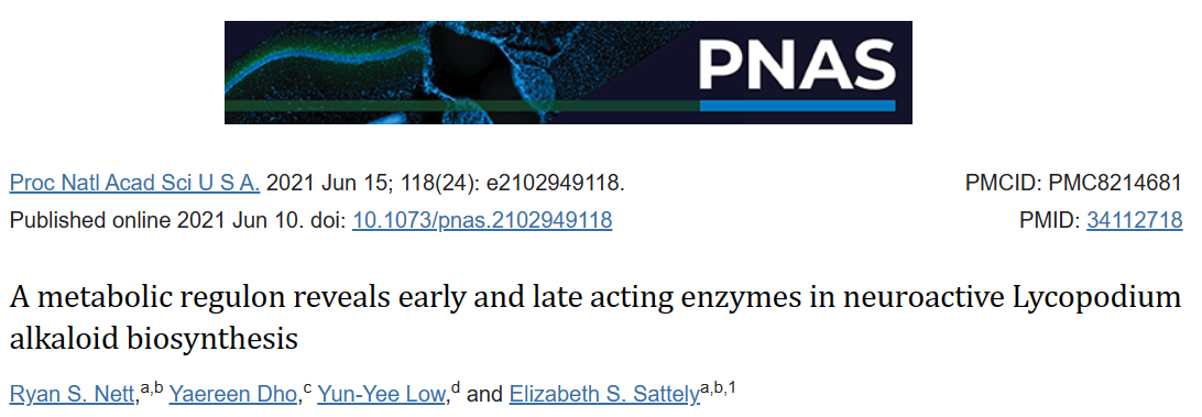 2021年6月,斯坦福大學 Elizabeth S. Sattely 團隊在國際頂尖學術期刊《美國國家科學院院刊》PNAS發(fā)表一項重要研究成果,題為:A metabolic regulon reveals early and late acting enzymes in neuroactive Lycopodium alkaloid biosynthesis。研究通過代謝組學和轉錄組學的方法,確定了一組發(fā)育受控的生物合成基因,或潛在的調節(jié)子,用于調控石松生物堿的生物合成。