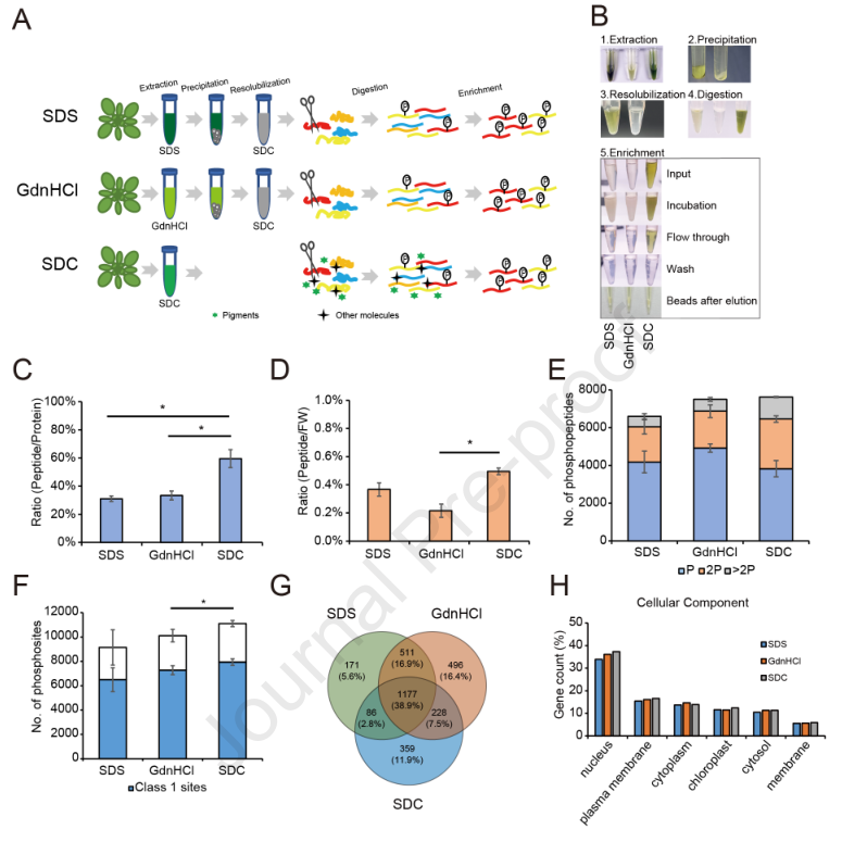 從植物組織中高效提取蛋白質是深入分析植物蛋白質組和磷酸化蛋白質組的第一步和關鍵一步。為此,作者比較了SDS、GdnHCl和SDC等不同變性劑對擬南芥葉片中蛋白質的提取性能。結果發(fā)現(xiàn)SDS-和SDC-提取的蛋白的性能相似,但優(yōu)于GdnHCl。植物樣品相較于動物樣品含有較低濃度的蛋白質,因此作者優(yōu)化了磷酸化蛋白質組的提取和富集的方法,即用SDS或GdnHCl緩沖液提取的蛋白質樣品,在蛋白質消化和隨后的磷酸肽富集之前,必須去除變性劑(圖1A)。接著用氯仿-甲醇沉淀提取的樣品,去除變性劑和其他干擾生物分子(圖1A和1B)。而作者通過實驗發(fā)現(xiàn),SDC法提取的蛋白樣本不需要經過氯仿-甲醇沉淀,而鑒定到的磷酸化蛋白更多,同時需要的植物材料更少。因此作者認為SDC法更節(jié)省成本達到更好的效果,并在番茄、水稻、綠藻等生物中得到驗證,從而確定了磷酸化蛋白組學的方法,稱之為GreenPhos。