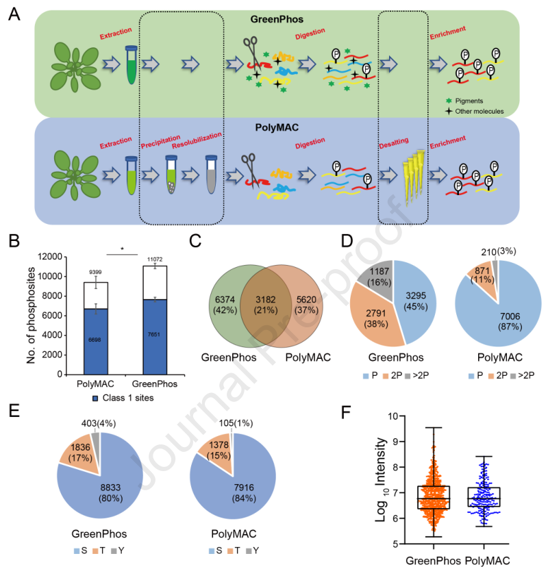 2023年11月27日,中國科學院遺傳與發(fā)育生物學研究所汪迎春團隊在Molecular Plant在線發(fā)表了題為GreenPhos, a universal method for in-depth measurement of plant phosphoproteomes with high quantitative reproducibility?的研究論文。論文中報道了一種具有突破性的植物磷酸化蛋白質組學新技術。該技術采用了簡化、穩(wěn)健的工作流程,有效地克服了植物磷酸化蛋白質組分析的主要技術難點,能高靈敏度、高特異性快速地富集植物磷酸肽。利用該技術可定量分析不同植物的磷酸蛋白質組,其分析深度之深、定量重復性之高前所未有,有望成為植物磷酸蛋白組學的通用技術。由于該技術主要面向高等植物及其它綠色生物(如衣藻),且操作簡便,極大地降低了實驗所需的人力和試劑費用,因此命名為GreenPhos (綠磷)。