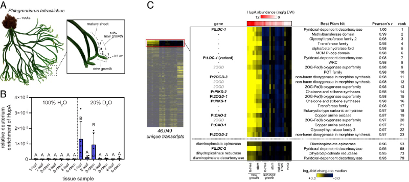 為了指導對石松生物堿生物合成的研究,作者重點關注 HupA,因為它已知具有作為 AChE 抑制劑的活性和作為藥物的潛力。HupA 由石松屬內的物種產生,但這些物種的 HupA 積累水平差異很大。作者推斷物種中 HupA 的增加可能與上調的生物合成基因表達有關。因此,檢測了石松屬的幾個物種的 HupA 含量,結果發(fā)現(xiàn)P. tetrastichus(圖 2A)積累了 HupA 到最高水平。因此,后續(xù)的研究將集中在該物種上。之前的研究表明,從頭 HupA 生物合成對P. tetrastichus枝條的新生長具有特異性,接著作者通過氘同位素標記實驗得到驗證,并且發(fā)現(xiàn)與莖相比,HupA標記在葉中更廣泛分布,表明這里的生物合成基因表達富集(圖2B)。因此,作者對對該物種的多個組織進行了RNA-seq分析,揭示石杉生物堿生物合成基因在活性組織中的積累機制。