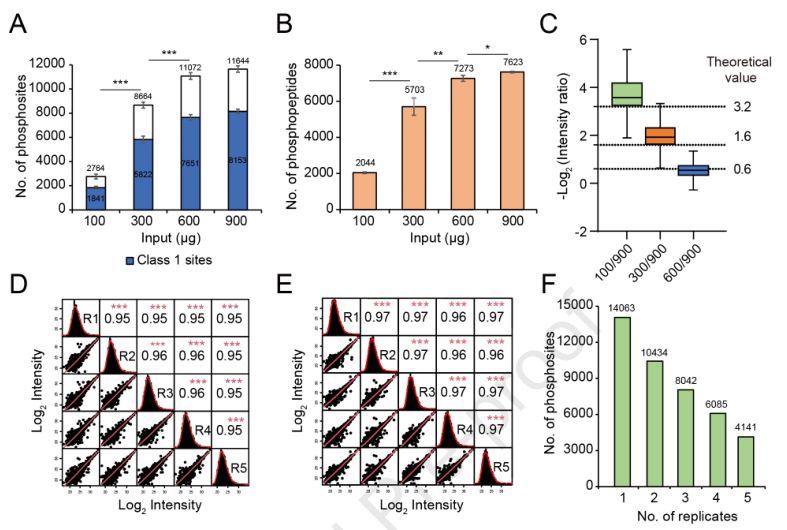 為了評估GreenPhos在定量磷酸化蛋白質組學中的潛力,作者了鑒定的磷酸化肽與上機量之間的定量關系。以900μg為參照,在100、300和600μg中,檢測到的磷酸肽強度比與參考中磷酸肽強度比的中位數(shù)與理論值具有很好的相關性(圖3C)。分析結果表明,GreenPhos與單次LC-MS結合可用于從高達600μg的蛋白質中定量磷酸肽,準確度高。通過5次重復質譜分析,評價了GreenPhos在植物磷蛋白組定量鑒定中的再現(xiàn)性。5個生物重復和5個技術重復的磷酸肽強度的Pearson相關系數(shù)平均分別為0.95和0.97 (圖3D和3E),表明具有較高的定量可重復性。從5個生物重復中共鑒定出磷酸化位點14063個,其中74%的磷酸化位點至少在2個重復中鑒定出 (圖3F)。結果表明,GreenPhos可以在定量和定性上產生高度可重復性的結果。