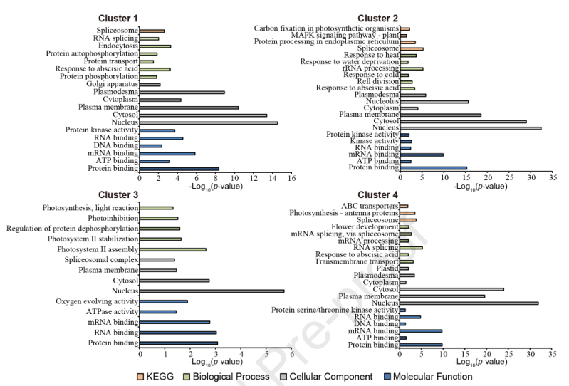 使用Fisher’s-exact對每個簇中的磷酸化蛋白進行GO和KEGG富集分析(圖5)。與報道一致,在細胞組分條目,細胞核、細胞質和細胞膜蛋白在所有簇中被顯著富集。在分子功能條目,激酶活性在簇1、2和4中富集,而在簇3中不富集,但是蛋白質去磷酸化的在生物過程條目在簇3中富集。結果表明,激酶的磷酸化激活和磷酸酶的去磷酸化是鹽脅迫誘導的重要反應。
