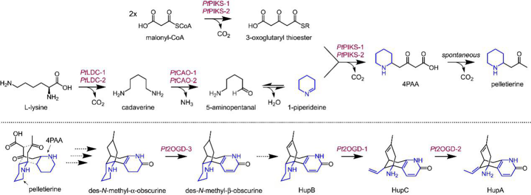 目前研究尚未證實 HupA 生物合成中的任何下游中間體,但從各種苔蘚物種中分離生物堿可能與兩個含8碳哌啶的亞基摻入石松生物堿的生物合成相關(圖 1B)。但是詳細的代謝合成機制還不清楚。作者通過與4PAA/peletierine生物合成的 3 個高度共表達基因分析,作者發(fā)現(xiàn)了富集最顯著的一類酶:Fe(II)/2-氧代戊二酸依賴性雙加氧酶(2OGDs)(圖2B,C)。作者將這些高度共表達的2OGD作為下游石松生物堿代謝途徑中的強候選基因。
