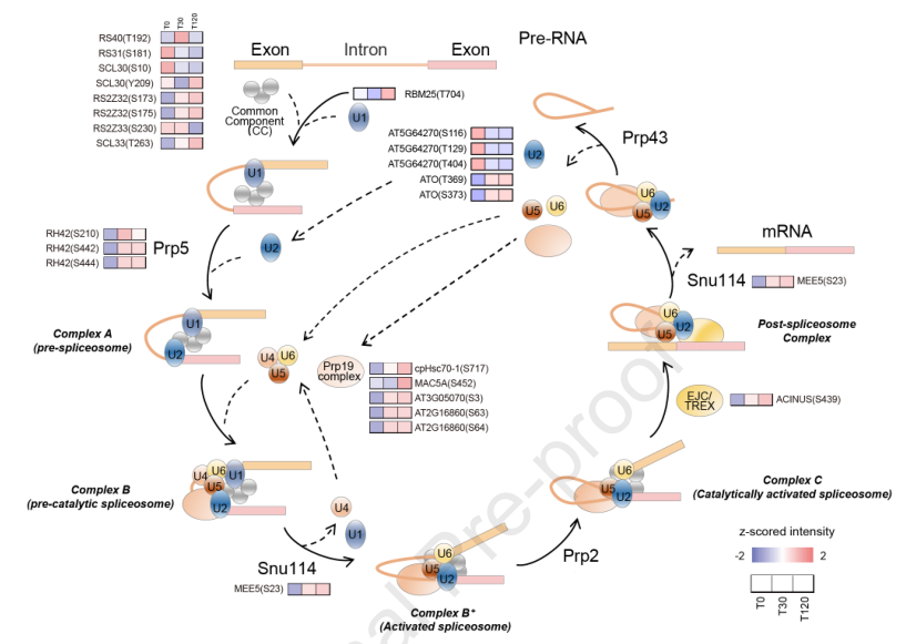 除了激酶外,在簇1、2和4中剪接體被KEGG通路顯著富集 (圖5),暗示磷酸化調控mRNA的可變剪接,是植物響應脅迫的關鍵過程。在鹽脅迫下,18個剪接體蛋白上共有28個不同的位點被差異磷酸化 (圖7)。利用PRM進一步驗證了Y209在SCL30上的差異磷酸化(圖6)。據(jù)報道,RNA解旋酶及其磷酸化對剪接體的組裝至關重要。在鹽脅迫30分鐘后,Prp5的S210、S442和S444位點磷酸化增加,并在120分鐘后保持高水平,Prp19的多個亞基也觀察到類似的磷酸化模式(圖7)。盡管這些差異磷酸化事件的意義尚未得到明確的證明,但它們可能參與了鹽脅迫誘導的mRNA剪接的調控。