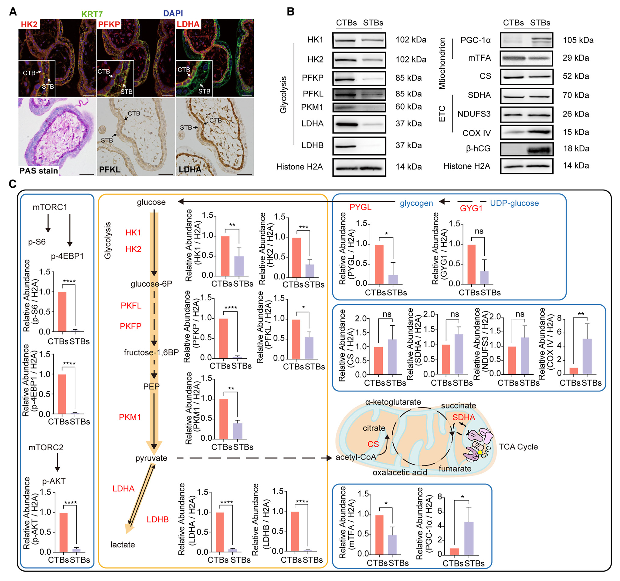 通過免疫組織化學和免疫熒光染色在孕早期人類胎盤絨毛組織中,證實了許多關鍵的糖酵解酶,包括己糖激酶2 (HK2)、磷酸果糖激酶、血小板型(PFKP)、磷酸果糖激酶、肝型(PFKL)和乳酸脫氫酶A (LDHA),確實在CTBs中比體內STBs更廣泛地表達(圖1A)。通過實時qPCR和免疫印跡(圖1B)繪制關鍵代謝酶的變化。結果顯示,糖酵解酶,包括己糖激酶1 (HK1)、HK2、PFKP、PFKL、丙酮酸激酶M1 (PKM1)、LDHA和乳酸脫氫酶B (LDHB), CTBs均顯著高于STBs(圖1B和1C)。線粒體生物發(fā)生相關轉錄因子PGC1a和細胞色素氧化酶(COX) IV在STBs中高表達,而糖原代謝酶肝糖原磷酸化酶(PYGL)和糖原1 (GYG1)在CTBs中高于STBs(圖1C),與糖原的周期性酸-希夫(PAS)染色一致(圖1A)。在主要調控糖酵解酶的磷脂酰肌醇3-激酶(PI3K)-哺乳動物雷帕霉素靶蛋白(mTOR)通路中,CTBs中蛋白激酶B (AKT)、核糖體蛋白S6 (S6)和真核翻譯起始因子4E (4EBP1)的磷酸化水平顯著高于STBs(圖1C左)。這些結果表明,糖酵解和糖原溶解的糖代謝途徑在合胞滋養(yǎng)細胞中顯著減少,而OxPhos水平基本保持不變。