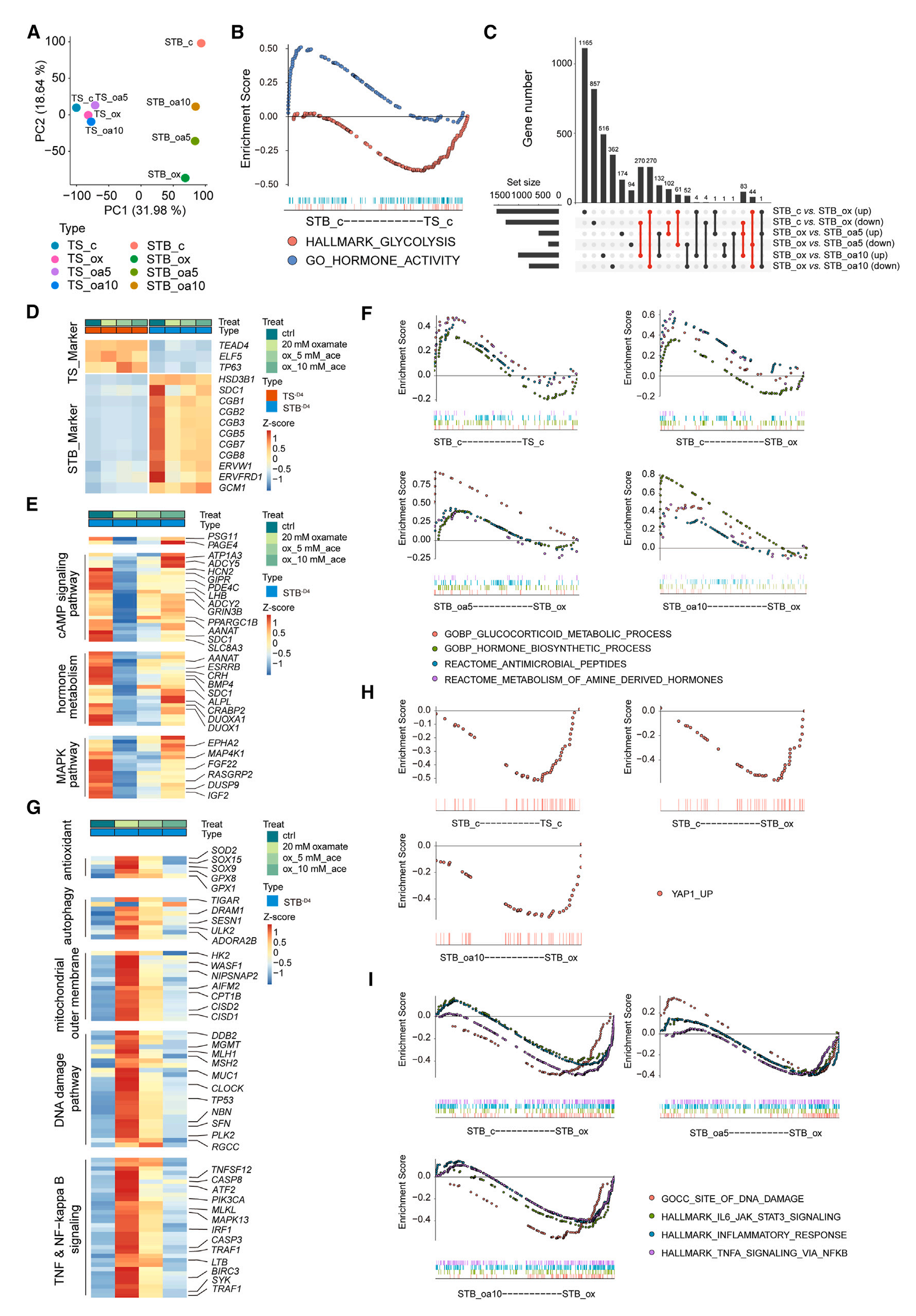 此外,GSEA進一步顯示,與未分化的HTSC (TS_c)相比,STB_c中特異性富集了糖皮質激素、激素生物合成、抗菌肽和胺源性激素等四個基因集(圖5F)。此外,與單獨處理STB_ox的STB_c和STB_d4 (STB_oa5和STB_oa10)相比,這四個基因組在同時處理的STB_c和STB_d4中也顯著富集。