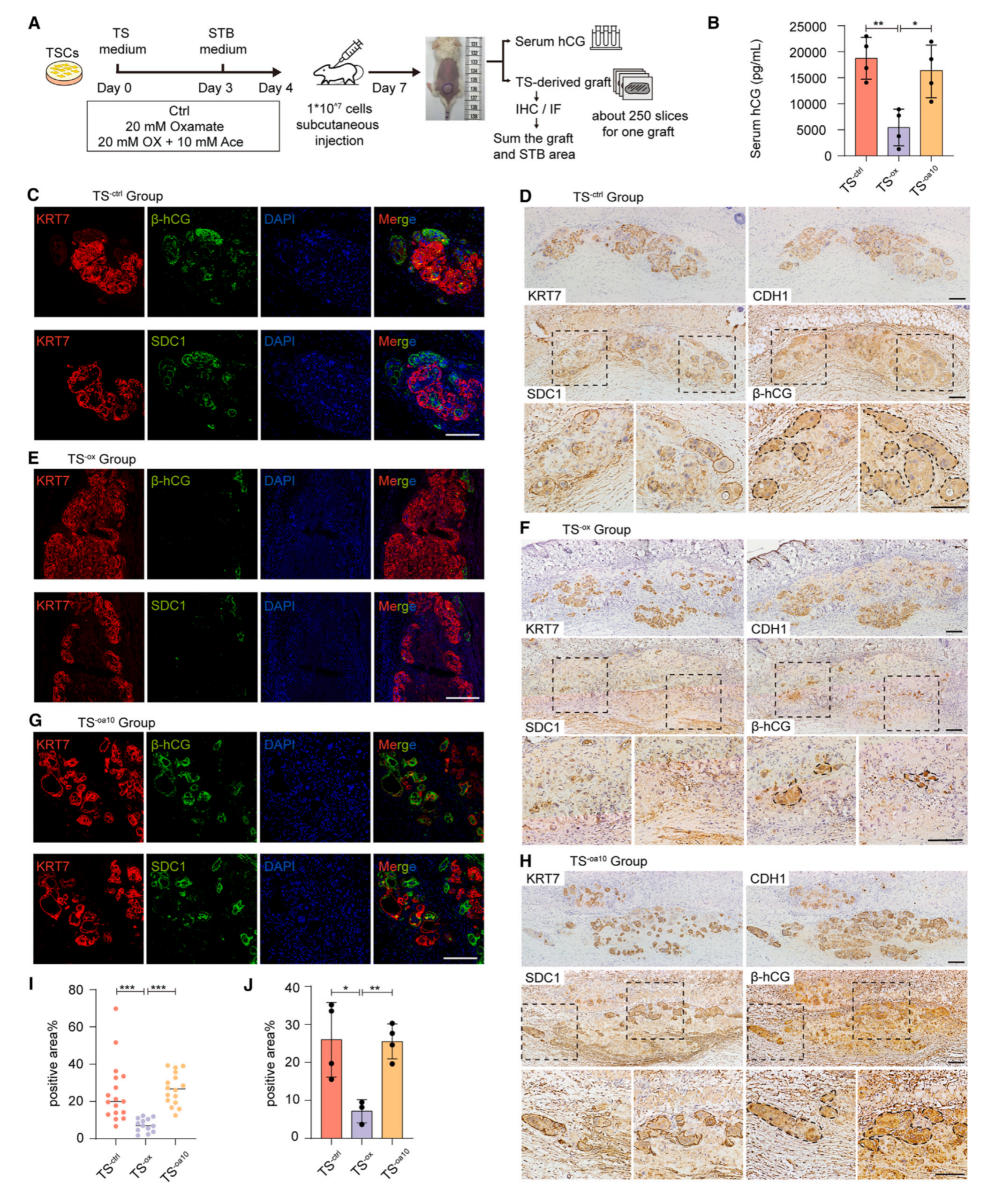 小鼠皮下注射對照hTSCs (TS-ctrl)、氨基甲酸酯處理hTSCs (TS-ox)和氨基甲酸酯和醋酸酯短暫處理hTSCs (TS-oa10)。隨意喂養(yǎng)NOD-SCID小鼠生長7天后,檢測血清hCG,并對移植的滋養(yǎng)細胞進行免疫熒光和免疫組織化學染色,以確定體內滋養(yǎng)細胞的合胞程度(圖7A)。然而,結果顯示STBs分泌到TS-ox小鼠血清中的hCG明顯低于TS – control小鼠(圖7B)。這與靶向數(shù)據(jù)一致,顯示在STB分化的第1天,乙酰輔酶A已經開始上升,轉錄和表觀基因組數(shù)據(jù)顯示,STB分化的許多標記已經在第1天開始上升。因此,滋養(yǎng)層細胞在分化24小時內就已經進入了STB的命運,在滋養(yǎng)層分化的這個時間點干擾糖酵解代謝可能對細胞命運產生不可逆的影響,但不影響細胞活力。