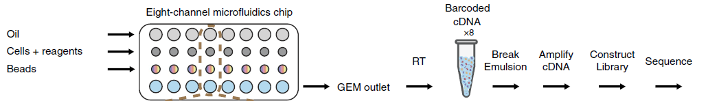 10 X Genomics單細胞轉(zhuǎn)錄組測序平臺利用微流控、油滴包裹和baecode標(biāo)記等技術(shù)來實現(xiàn)高通量的細胞捕獲技術(shù),能夠一次性分離、并標(biāo)記500–10000個單細胞,從而獲得每個細胞的3’端的轉(zhuǎn)錄組信息。具有細胞通量高、建庫成本低、捕獲周期短等優(yōu)勢。該技術(shù)主要用于細胞分型和標(biāo)記因子的鑒定,從而實現(xiàn)對細胞群體的劃分與細胞群體間基因表達差異的檢測,此外該技術(shù)還可以預(yù)測細胞分化與研究發(fā)育軌跡,在當(dāng)下疾病、免疫、腫瘤領(lǐng)域以及組織、器官、發(fā)育研究中發(fā)揮越來越重要的作用。
