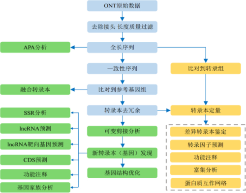 主要在于測序平臺不同。Illumina平臺主要是PE150測序,構(gòu)建小片段文庫,為邊合成邊測序,在建庫以及測序過程中均需要PCR擴(kuò)增,主要用于基因水平表達(dá)定量及差異表達(dá)分析。nanopre全長轉(zhuǎn)錄組測序無需打斷RNA,可獲得5’到3’全長轉(zhuǎn)錄本序列及其表達(dá)信息,對片段大小無偏好,直接檢測電信號無需邊合成邊測序其GC偏好性遠(yuǎn)低于二代平臺;同時(shí)由于無需拼接其在轉(zhuǎn)錄本層面的結(jié)構(gòu)變異檢測方面,比如可變剪接、融合基因、APA、新基因預(yù)測等具有絕對優(yōu)勢。