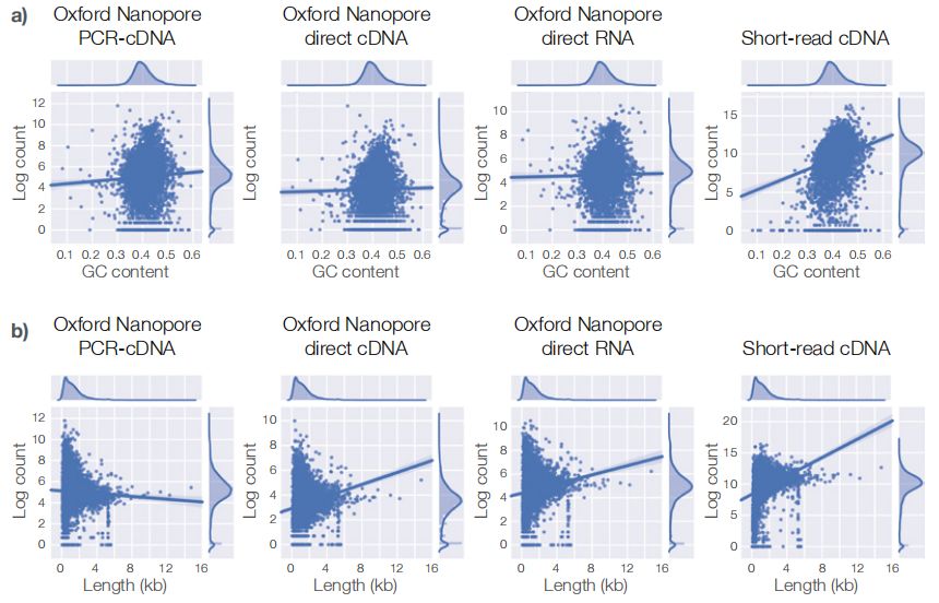 基因的GC含量和長度偏好影響基因表達(dá)定量結(jié)果,那么nanopore全長轉(zhuǎn)錄組測序比二代轉(zhuǎn)錄組測序在GC含量和長度偏好方面如何?