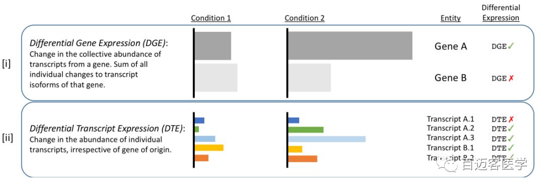 注:上圖列舉了2種情況下鑒定到的差異表達(dá)基因A和B,以及這2個基因鑒定到的各轉(zhuǎn)錄本差異表達(dá)情況。DGE表示差異表達(dá)基因,DTE表示差異表達(dá)轉(zhuǎn)錄本??梢姡瑢τ贐基因,雖然基因水平不顯著差異表達(dá),但是轉(zhuǎn)錄本水平,B.1和B.2都顯著差異表達(dá)。–[ref2]