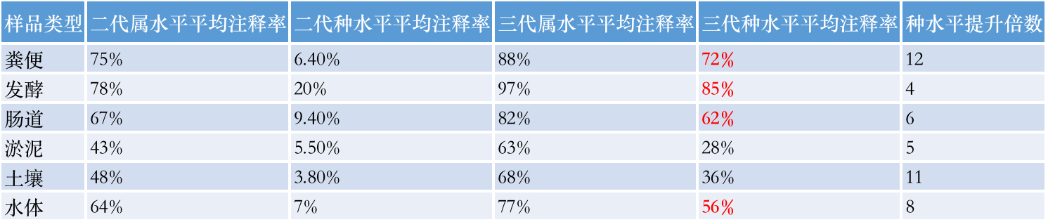 我們對不同類型的樣品如:土壤、糞便、腸道、水體等,隨機(jī)挑選了30個項(xiàng)目對其進(jìn)行物種注釋率進(jìn)行研發(fā)優(yōu)化,目前采用優(yōu)化數(shù)據(jù)庫及注釋方法的策略,將其種水平平均注釋率提升到60%+。二代注釋到屬和種的平均比例為78%和6%,相同樣品采用三代進(jìn)行注釋時(shí),屬和種水平平均注釋率為95%和60%,注釋結(jié)果提升非常明顯。