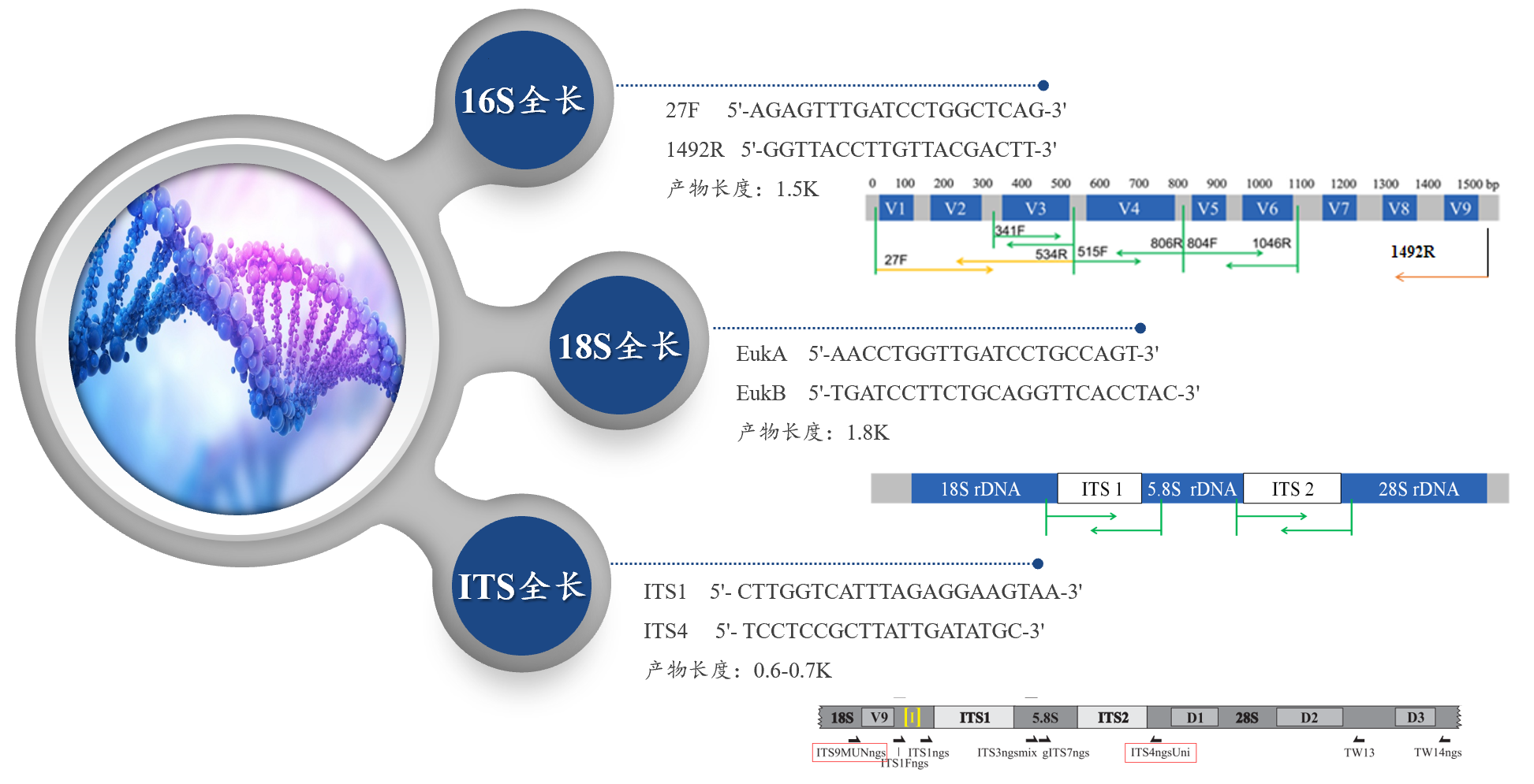 目前,微生物多樣性研究主要是于編碼核糖體RNA的核酸序列保守區(qū)進(jìn)行的。細(xì)菌主要是基于16S區(qū),真菌主要基于18S區(qū)或ITS區(qū)(內(nèi)轉(zhuǎn)錄間區(qū)),16S rDNA 是編碼原核生物核糖體小亞基rRNA(16S rRNA)的DNA序列,18S rDNA是編碼真核生物核糖體小亞基rRNA(18S rRNA)的DNA序列,ITS是編碼真核生物核糖體小亞基rRNA的DNA內(nèi)轉(zhuǎn)錄間隔區(qū)序列。這些序列中既有保守區(qū)又有可變區(qū),保守序列區(qū)域反映了生物物種間的親緣關(guān)系,而高變序列區(qū)域則能體現(xiàn)物種間的差異。由于18S rDNA在進(jìn)化速率上比較保守,在系統(tǒng)發(fā)育研究中較適用于種級以上階元的分類。常用作微生物分類研究的ITS分為ITS1和ITS2兩種。ITS1位于真核生物核糖體rDNA序列的18S和5.8S之間,ITS2位于真核生物核糖體rDNA序列5.8S和28S之間。由于ITS區(qū)在核糖體RNA加工過程中被剪切掉,不發(fā)揮功能作用,在進(jìn)化過程中選擇壓力較小,進(jìn)化速率約為18S rDNA的10倍,屬于中度保守的區(qū)域,利用它可研究種及種以下的分類階元。另外,也可通過選擇引物同時(shí)擴(kuò)增18S rDNA和ITS,通過分析18S rDNA序列,先在較高級別上確定樣品的歸屬,然后根據(jù)ITS 序列,將真菌歸類到種或亞種水平。