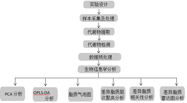 脂質組學是對生物體內的脂質進行系統(tǒng)分析的一門新興學科,是非靶代謝組學的重要分支?;谝嘿|聯(lián)用技術(LC-MS),無偏向性、盡可能多的檢測細胞、組織、器官或體液等生物樣本內所有脂質分子,對實驗組和對照組進行比對分析,通過統(tǒng)計分析篩選差異脂質分支,進而尋找脂質代謝變化與生理病理變化的相對于關系,揭示脂質在各種生命活動中的作用機制。