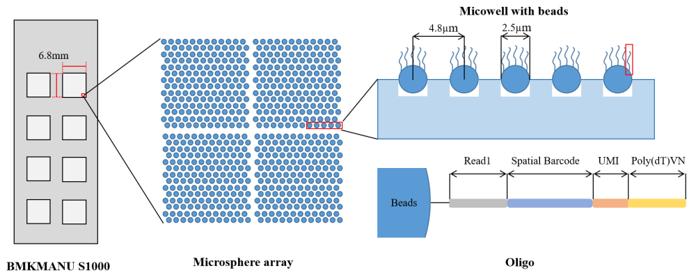通過(guò)空間轉(zhuǎn)錄組的切片、組織優(yōu)化(摸索最*透化時(shí)間)、基因表達(dá)步驟后。使得每個(gè)mRNA分子帶有Spatial Barcode,在建庫(kù)測(cè)序時(shí)選擇ONT平臺(tái)進(jìn)行上機(jī)測(cè)序。通過(guò)后續(xù)的配套分析軟件完成從下機(jī)數(shù)據(jù)到基因表達(dá)矩陣的構(gòu)建。