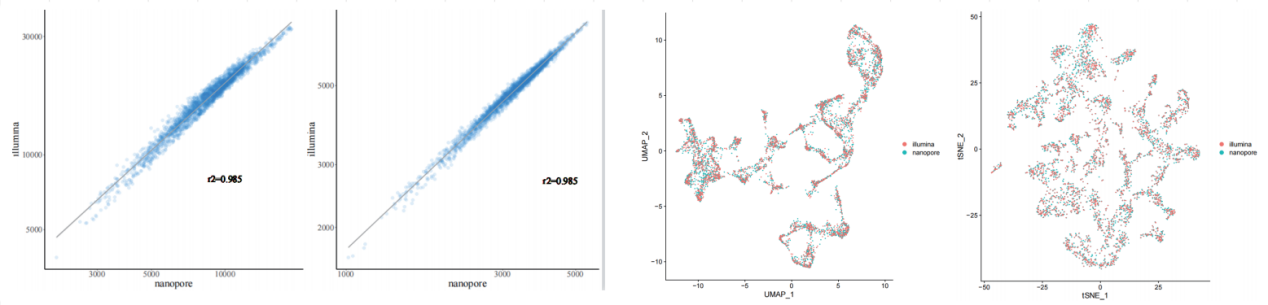 數(shù)據(jù)的相似性與準(zhǔn)確性進(jìn)行了展示與介紹,無(wú)論是二代與三代數(shù)據(jù)的UMI/Gene counts per spot的相關(guān)性還是tSEN/U-MAP的降維聚類(lèi),都顯示該產(chǎn)品具有非常高的準(zhǔn)確性。這充分說(shuō)明百創(chuàng)S1000全長(zhǎng)轉(zhuǎn)錄組產(chǎn)品完全可以獨(dú)立進(jìn)行數(shù)據(jù)的拆分與挖掘分析,無(wú)需依賴(lài)NGS數(shù)據(jù)的校正。