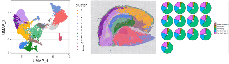 空間三代全長(zhǎng)轉(zhuǎn)錄組可以對(duì)結(jié)構(gòu)進(jìn)行分析。在50μm(Level7)分辨率下,對(duì)各Culster的可變剪接的事件數(shù)量進(jìn)行了分析。結(jié)果顯示外顯子跳躍的類(lèi)型最多。除可變剪接外,針對(duì)融合基因分析的結(jié)果同樣進(jìn)行了展示。